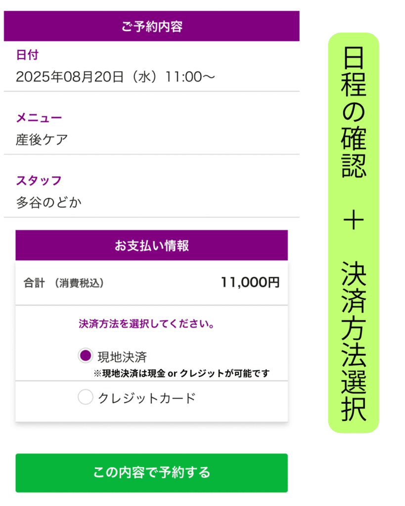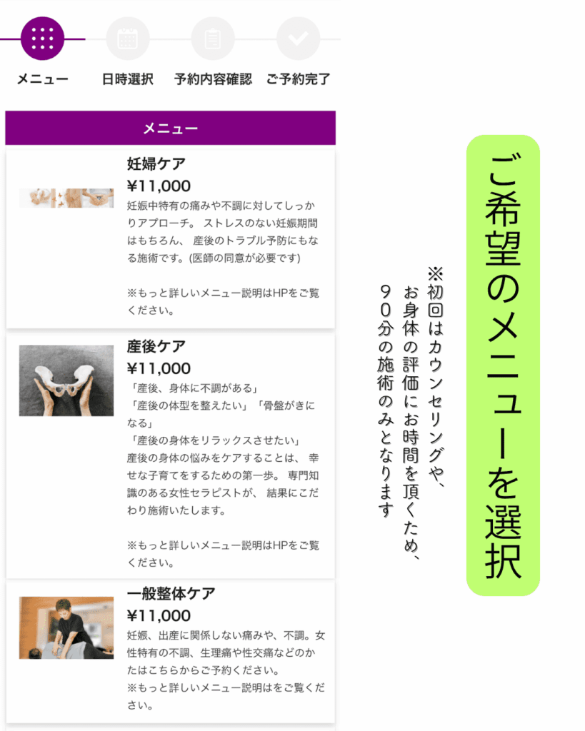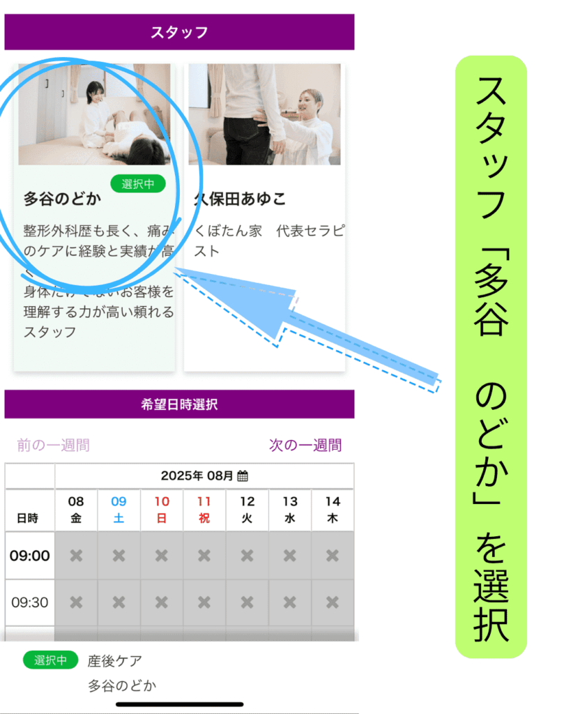 ③ 施術メニューとスタッフを選択後、お好きな日時を選択してください